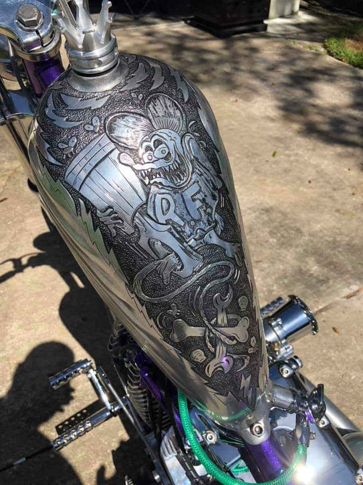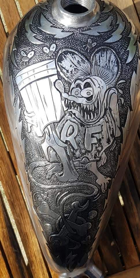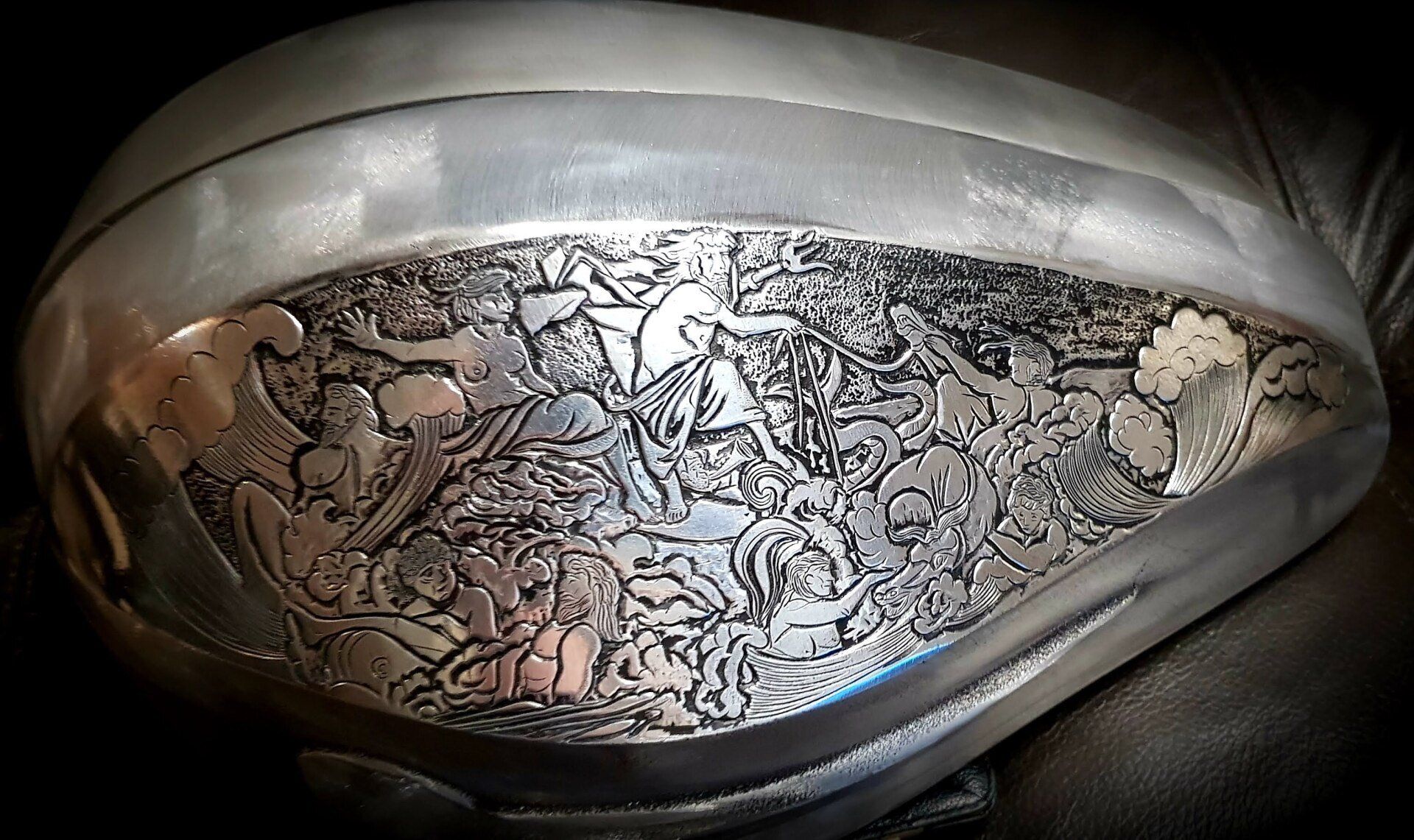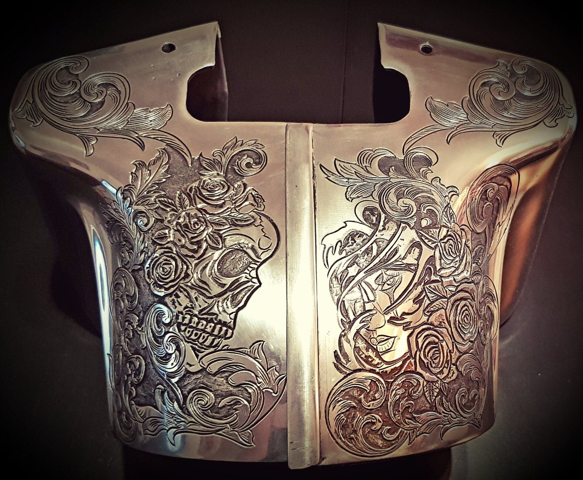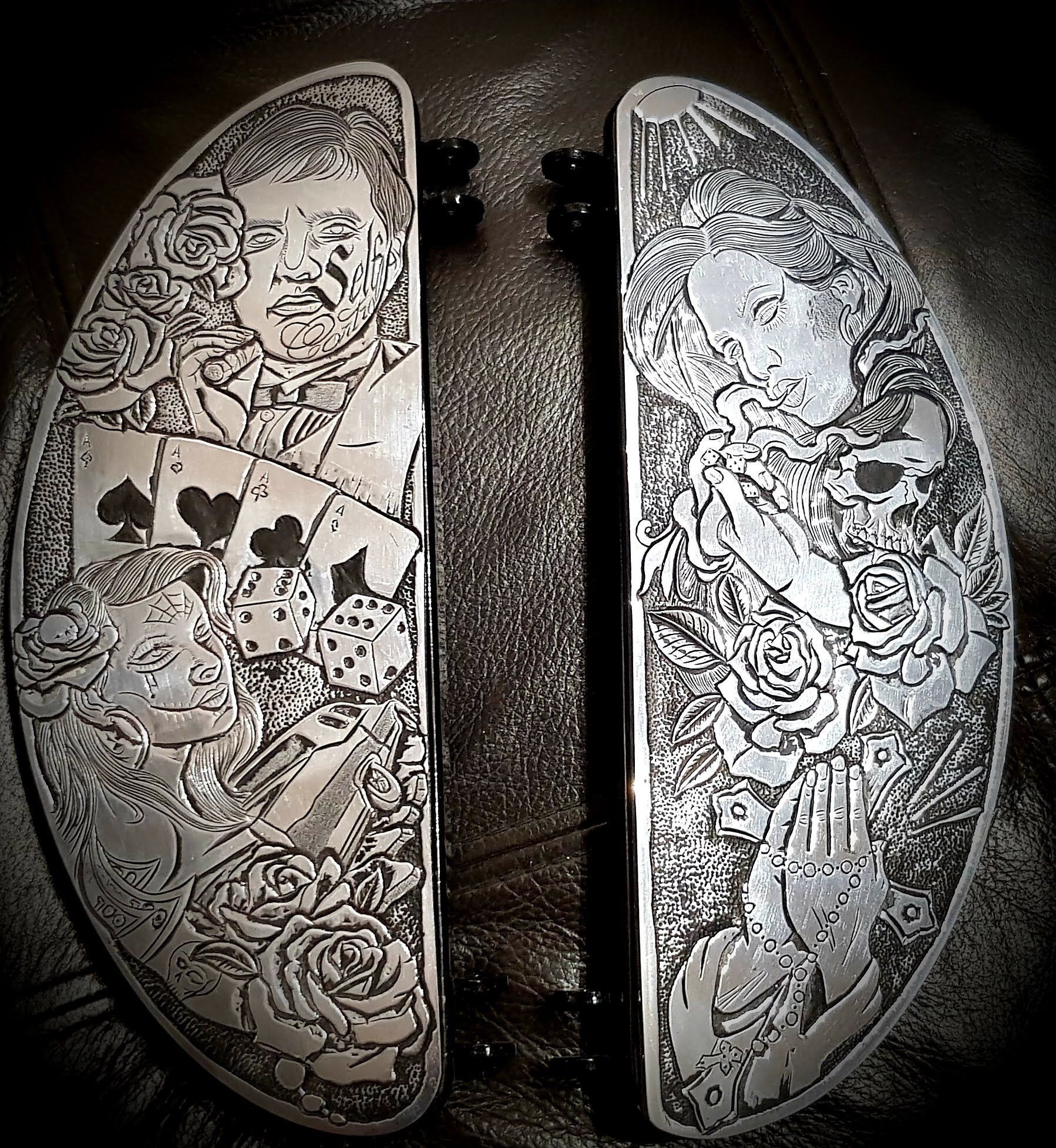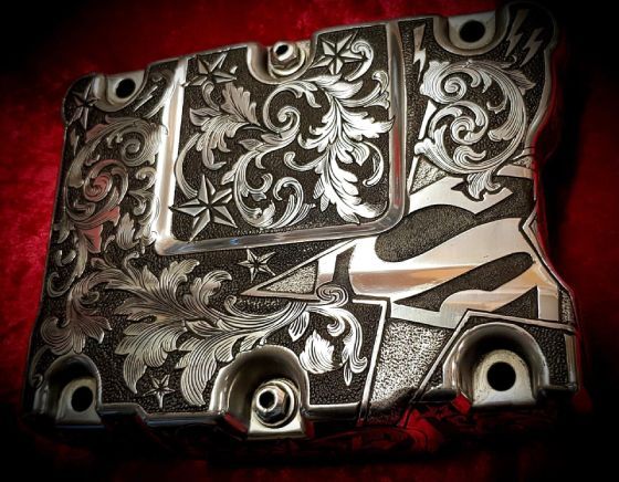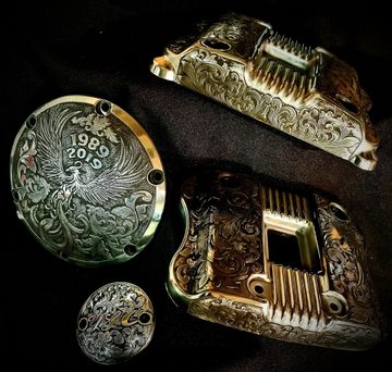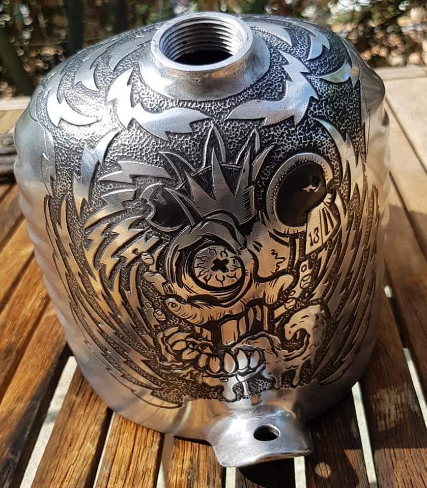 Bruno s'affaire à pousser les limites de son art en innovant les techniques et les designs afin de toujours surprendre. Déjà reconnu de le milieu de la Kustom Kulture avec ses nombreuses réalisations sur les carters et autres pièces de Motos. Il a su varier ses plaisirs et poser sa touche très personnelle notamment sur des ornements de mobilier, des boucles de ceinture, des broches et des pin's, des chevalières, instruments de musique et bien d’autres bijoux et objets en métal de toutes origines.